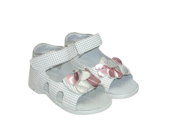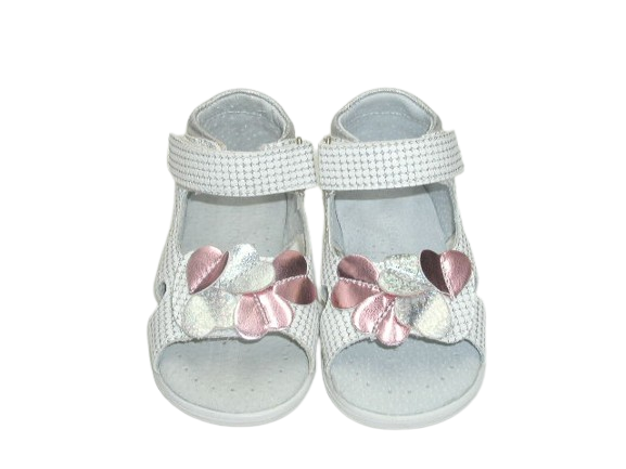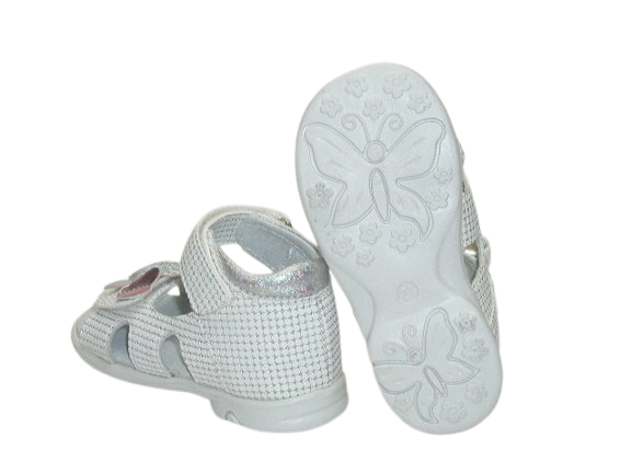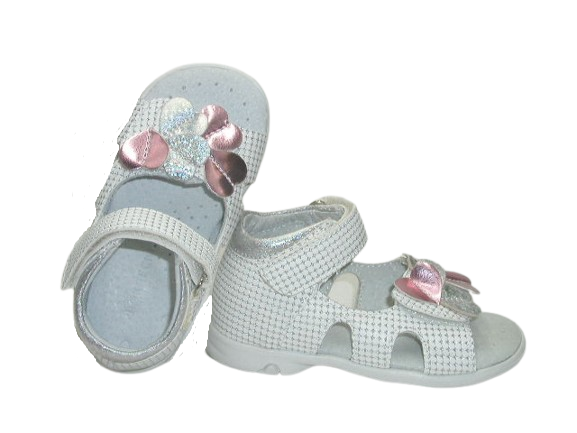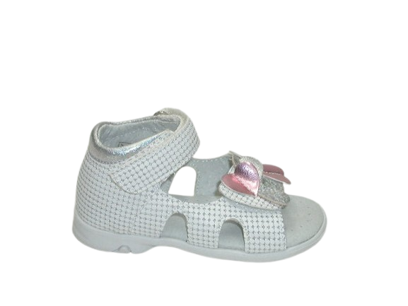 Prezentujemy śliczne sandałki dla dziewczynek w kolorze srebrnym. Buciki ozdobione są błyszczącymi serduszkami, zapinane na dwa rzepy. Wnętrze buta wykonane w całości z wysokiej jakości skóry naturalnej, dzięki której delikatne stópki mają zapewnioną zdrową wentylację oraz nie powoduje otarć. Sandałki dobrze prezentują się na stopie. Częściowo zabudowana pięta i odpowiednio usztywnione zapiętki wspierają prawidłową stabilizację. Model sprawdzi się na co dzień jak i od święta.