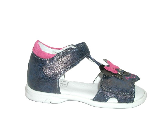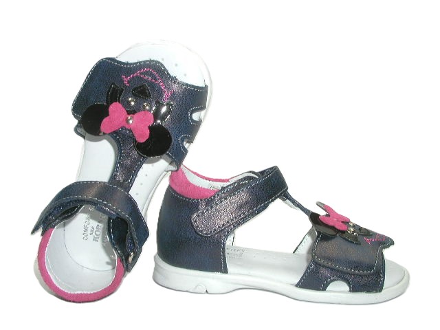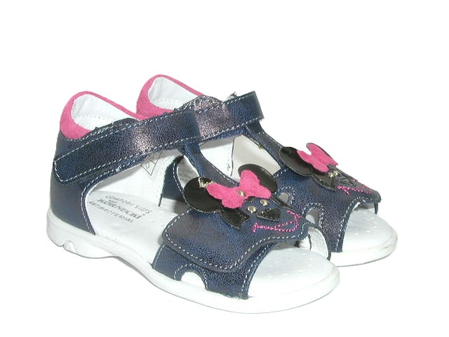 Prezentujemy śliczne sandałki dla dziewczynek ozdobione aplikacją w postaci myszki. Rzep w okolicy palców pozwoli dopasować model do tęgości stopy. Wnętrze buta wykonane w całości z wysokiej jakości skóry naturalnej, dzięki której delikatne stópki mają zapewnioną zdrową wentylację oraz nie powoduje otarć. Sandałki dobrze prezentują się na stopie. Zabudowana pięta i odpowiednio usztywnione zapiętki wspierają prawidłową stabilizację. Model sprawdzi się na co dzień jak i od święta.