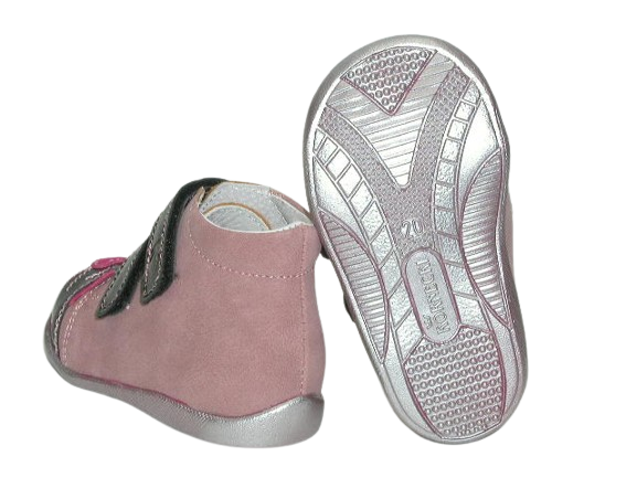 Prezentujemy śliczne trzewiki dziewczęce zaprojektowane z myślą o dzieciach, które zaczynają stawiać pierwsze kroki. Wnętrze buta w całości wykonane zostało ze skóry naturalnej absorbującej wilgoć oraz nieprzyjemne zapachy. Wkładka skórzana, profilowana, miękko podpiankowana. Wysoka cholewka w połączeniu z usztywnionym zapiętkiem pomaga stabilizować chód dziecka. Podwyższony, szeroki czubek ułatwia swobodne ułożenie palców w bucie. Cholewka w ciekawą aplikacją na nosku z pewnością spodoba się maluszkom. Projektując wzory stawiamy przede wszystkim na komfort i wygodę oraz zdrowy wpływ na stopy dzieci.