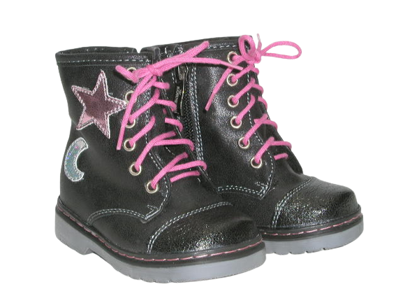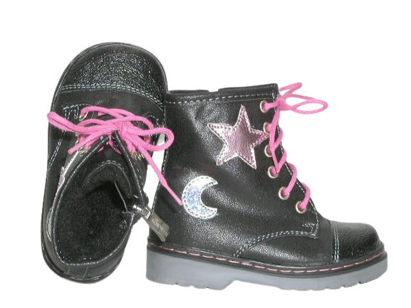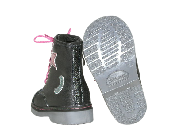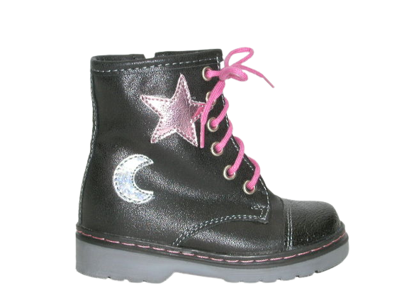 Prezentujemy zimowy model trzewików dziewczęcych typu glan. Urokliwe ozdoby na cholewce w postaci gwiazdki oraz półksiężyca zauroczy niejedną dziewczynkę. Projektując wzory stawiamy przede wszystkim na komfort i wygodę oraz zdrowy wpływ na stopy dzieci. Traperki są wiązane sznurówkami, dzięki czemu łatwiej dopasować je można do stóp dziecka. Dodatkowo od wewnętrznej strony wzór wyposażony w zamek na całej długości. Dwie możliwości regulacji ułatwią wkładanie i zdejmowanie.